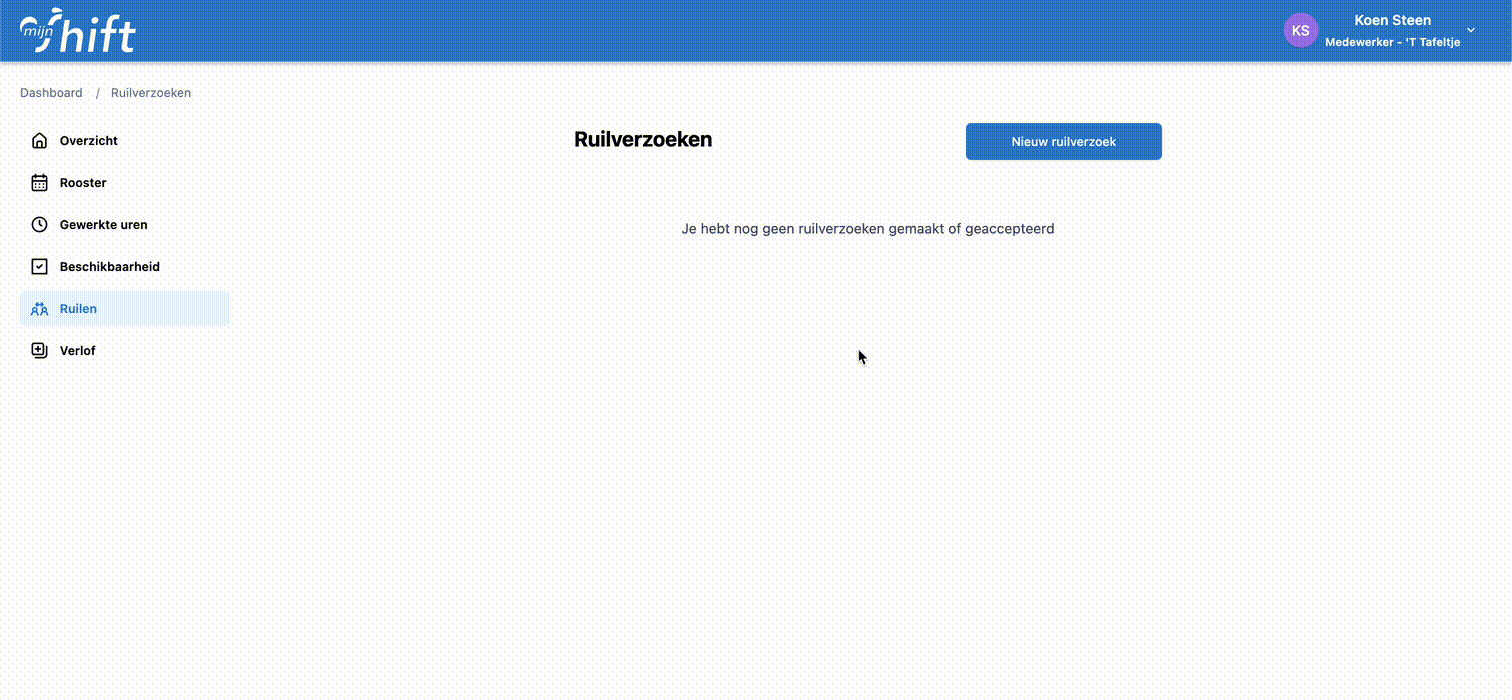 Shifts ruilen doe je via Ruilen in de linkernavigatie. Op deze pagina zie je de status van je ruilverzoeken en kun je nieuwe ruilverzoeken aanmaken.